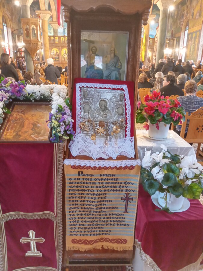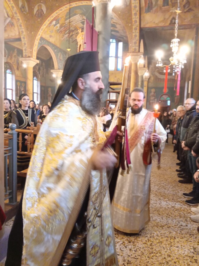 Πλήθος κόσμου συγκεντρώθηκε στην πλατεία του χωριού, όπου στις 18:30 ξεκίνησε η λιτάνευση της Ιεράς Εικόνας προς τον ναό, συνοδευόμενη από ιερείς, ιεροψάλτες, τα μέλη του Πολιτιστικού Συλλόγου με παραδοσιακές στολές, τοπικές αρχές και ευλαβείς κατοίκους. Κατά τη διάρκεια της πομπής επικράτησε βαθιά συγκίνηση και κατανυκτική ατμόσφαιρα, καθώς οι πιστοί υποδέχθηκαν με σεβασμό και προσευχή το ιερό κειμήλιο.