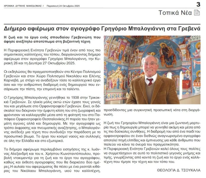 κοινοποίηση FacebookXPinterestWhatsApp Πρέπει να διαβάσετε «Συγχαρητήριο μήνυμα της Διεύθυνσης Δευτεροβάθμιας Εκπαίδευσης Γρεβενών για τη διάκριση μαθήτριας στο Πανελλήνιο Σχολικό Πρωτάθλημα Αντισφαίρισης ΓΕΛ & ΕΠΑΛ 2025-2026» 15 Απριλίου 2026 Η Αντρομάνα στην Δεσκάτη 14 Απριλίου 2026 Δήμος Γρεβενών: Έκθεση Φωτογραφίας & Ζωγραφικής «Τα όμορφα χωριά των Γρεβενών: Ο τόπος και οι άνθρωποι». 14 Απριλίου 2026 TO BAZAAR ΤΟΥ ΠΑΣΧΑ 2026 ΤΗΣ “ΕΛΠΙΔΑΣ” ΓΕΦΥΡΑ ΑΓΑΠΗΣ 14 Απριλίου 2026 myGrevenaΔεν είμαστε “φορείς ” της Τέταρτης Εξουσίας. Ο ρόλος μιας εφημερίδας είναι να αφουγκράζεται τους πόνους και τις χαρές ενός τόπου και των ανθρώπων του και αυτούς να διακονεί, να υπηρετεί τις ανάγκες τους, όχι να εξουσιάζει. ΕιδησεογραφίαΓρεβενάΕκδηλώσεις Αφιέρωμα στον αγιογράφο Γρηγόριο Μπαλογιάννη Από myGrevena 24 Οκτωβρίου 2025 ΕτικέτεςΧΡΟΝΙΚΑ ΔΥΤΙΚΗΣ ΜΑΚΕΔΟΝΙΑΣ κοινοποίηση FacebookXPinterestWhatsApp Προηγούμενο άρθρο“School Hopping: Δυτική Μακεδονία, εκεί όπου η μάθηση γίνεται εμπειρία”Επόμενο άρθροΔίδου ἡμῖν ἐκτυπώτερον… Πρόσφατες δημοσιεύσεις Τα υφαντά της Σαμαρίνας 15 Απριλίου 2026 Από Δευτέρα 20 Απριλίου η υποβολή αιτήσεων επιχειρήσεων για τη νέα δράση απασχόλησης της ΔΥΠΑ με επιδότηση έως 14.220 € σε περιοχές απολιγνιτοποίησης 15 Απριλίου 2026 Πρόσκληση στις Πολιτιστικές Εκδηλώσεις των Αμυγδαλιών Γρεβενών. 15 Απριλίου 2026 Λειτουργία Ψυχιατρικού Ε.Ι. στο Γ.Ν. Γρεβενών 15 Απριλίου 2026 Ευχαριστήρια επιστολή 15 Απριλίου 2026