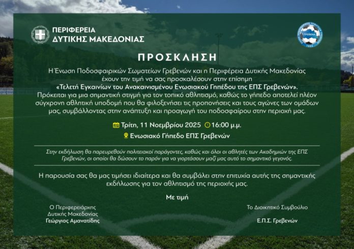 Την Τρίτη 11 Νοεμβρίου 2025 και ώρα 16:00, η Ένωση Ποδοσφαιρικών Σωματείων Γρεβενών και η Περιφέρεια Δυτικής Μακεδονίας διοργανώνουν την επίσημη τελετή εγκαινίων του ανακαινισμένου Ενωσιακού Γηπέδου “Χρήστος Ευαγγελόπουλος”, σε μια εκδήλωση που αναμένεται να αποτελέσει σημαντικό ορόσημο για τον τοπικό αθλητισμό.