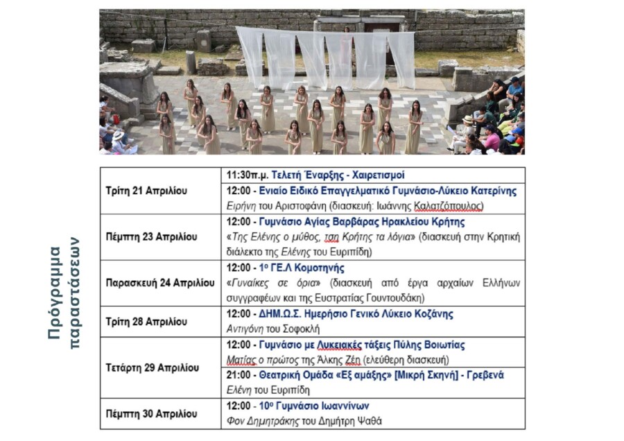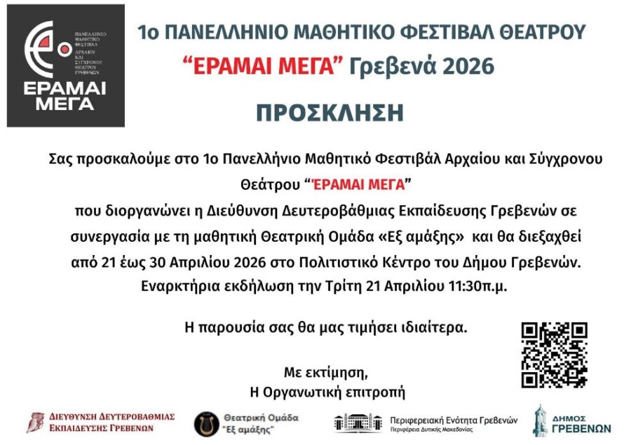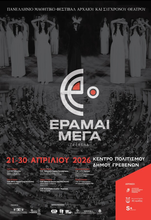 Τα Γρεβενά ετοιμάζονται να φορέσουν τα γιορτινά τους και να γίνουν, από τις 21 έως τις 30 Απριλίου, ένα ζωντανό κύτταρο θεάτρου, παιδείας και δημιουργίας. Το 1ο Πανελλήνιο Μαθητικό Φεστιβάλ Αρχαίου και Σύγχρονου Θεάτρου «ΕΡΑΜΑΙ ΜΕΓΑ» αποτελεί μια μεγάλη γιορτή παραστάσεων και ένα ουσιαστικό αντάμωμα σχολείων, ιδεών και νέων ανθρώπων που εκφράζονται μέσα από την τέχνη.
