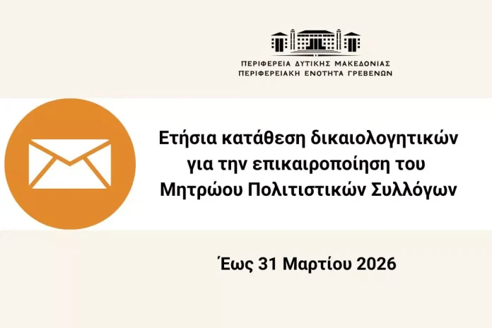 Από τη Δ/νση Βιομηχανίας, Εμπορίου, Παιδείας και Απασχόλησης της Π.Ε. Γρεβενών, σας ενημερώνουμε ότι οι πολιτιστικοί σύλλογοι της Περιφερειακής Ενότητας Γρεβενών καλούνται να υποβάλουν τα απαραίτητα δικαιολογητικά με σκοπό την ετήσια ενημέρωση του μητρώου πολιτιστικών συλλόγων της υπηρεσίας μας.