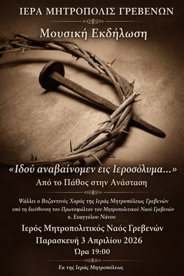 Η Ιερά Μητρόπολις Γρεβενών διοργανώνει μουσική εκδήλωση με τίτλο «Ιδού αναβαίνομεν εις Ιεροσόλυμα…», με θέμα «Από το Πάθος στην Ανάσταση», προσκαλώντας το κοινό σε μια κατανυκτική πορεία μέσα από την ιερά παράδοση της βυζαντινής μουσικής και το βαθύ πνευματικό νόημα των ημερών.