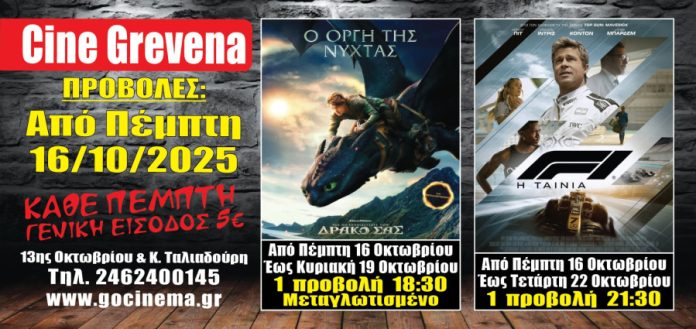 κοινοποίηση FacebookXPinterestWhatsApp Πρέπει να διαβάσετε Πρόσκληση στις Πολιτιστικές Εκδηλώσεις των Αμυγδαλιών Γρεβενών. 15 Απριλίου 2026 Λειτουργία Ψυχιατρικού Ε.Ι. στο Γ.Ν. Γρεβενών 15 Απριλίου 2026 Ευχαριστήρια επιστολή 15 Απριλίου 2026 «Συγχαρητήριο μήνυμα της Διεύθυνσης Δευτεροβάθμιας Εκπαίδευσης Γρεβενών για τη διάκριση μαθήτριας στο Πανελλήνιο Σχολικό Πρωτάθλημα Αντισφαίρισης ΓΕΛ & ΕΠΑΛ 2025-2026» 15 Απριλίου 2026 myGrevenaΔεν είμαστε “φορείς ” της Τέταρτης Εξουσίας. Ο ρόλος μιας εφημερίδας είναι να αφουγκράζεται τους πόνους και τις χαρές ενός τόπου και των ανθρώπων του και αυτούς να διακονεί, να υπηρετεί τις ανάγκες τους, όχι να εξουσιάζει. ΕιδησεογραφίαΓρεβενάΕκδηλώσεις Κινηματογράφος Από myGrevena 17 Οκτωβρίου 2025 ΕτικέτεςΚΙΝΗΜΑΤΟΓΡΑΦΟΣ κοινοποίηση FacebookXPinterestWhatsApp Προηγούμενο άρθροΠρεμιέρα για την ετήσια Εμποροπανήγυρη των Γρεβενών.Επόμενο άρθροΗμερίδα με θέμα «Η Ελληνική Χειροτεχνία στη Δυτική Μακεδονία του σήμερα» Πρόσφατες δημοσιεύσεις «Τα όμορφα χωριά των Γρεβενών: Ο τόπος και οι άνθρωποι»: Η αυλαία άνοιξε και τα Γρεβενά συστήνονται αλλιώς 16 Απριλίου 2026 Κινηματογράφος 16 Απριλίου 2026 Θερινό ωράριο καταστημάτων 16 Απριλίου 2026 Τα υφαντά της Σαμαρίνας 15 Απριλίου 2026 Από Δευτέρα 20 Απριλίου η υποβολή αιτήσεων επιχειρήσεων για τη νέα δράση απασχόλησης της ΔΥΠΑ με επιδότηση έως 14.220 € σε περιοχές απολιγνιτοποίησης 15 Απριλίου 2026