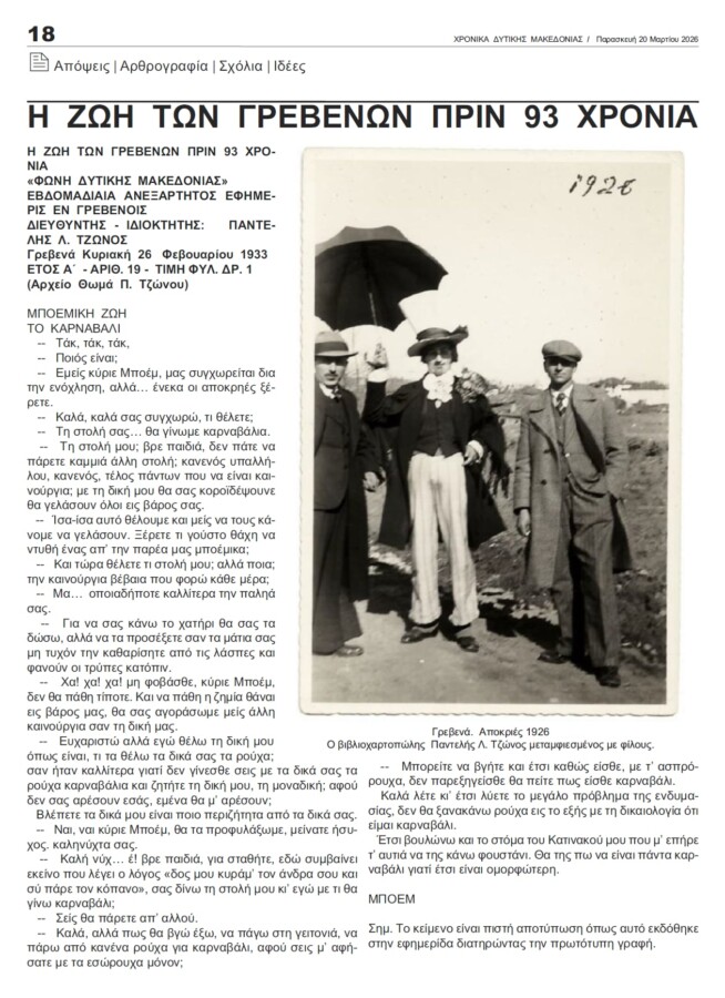 κοινοποίηση FacebookXPinterestWhatsApp Πρέπει να διαβάσετε «Συγχαρητήριο μήνυμα της Διεύθυνσης Δευτεροβάθμιας Εκπαίδευσης Γρεβενών για τη διάκριση μαθήτριας στο Πανελλήνιο Σχολικό Πρωτάθλημα Αντισφαίρισης ΓΕΛ & ΕΠΑΛ 2025-2026» 15 Απριλίου 2026 Η Αντρομάνα στην Δεσκάτη 14 Απριλίου 2026 Δήμος Γρεβενών: Έκθεση Φωτογραφίας & Ζωγραφικής «Τα όμορφα χωριά των Γρεβενών: Ο τόπος και οι άνθρωποι». 14 Απριλίου 2026 TO BAZAAR ΤΟΥ ΠΑΣΧΑ 2026 ΤΗΣ “ΕΛΠΙΔΑΣ” ΓΕΦΥΡΑ ΑΓΑΠΗΣ 14 Απριλίου 2026 myGrevenaΔεν είμαστε “φορείς ” της Τέταρτης Εξουσίας. Ο ρόλος μιας εφημερίδας είναι να αφουγκράζεται τους πόνους και τις χαρές ενός τόπου και των ανθρώπων του και αυτούς να διακονεί, να υπηρετεί τις ανάγκες τους, όχι να εξουσιάζει. ΕιδησεογραφίαΓρεβενάΙστορία Μια σπάνια φωτογραφία από την πόλη των Γρεβενών το 1926 Από myGrevena 21 Μαρτίου 2026 Από την σχετική στήλη στην εφημερίδα μας, ΧΡΟΝΙΚΑ ΔΥΤΙΚΗΣ ΜΑΚΕΔΟΝΙΑΣ. κοινοποίηση FacebookXPinterestWhatsApp Προηγούμενο άρθροΔήμος Κοζάνης: H Έκθεση «ΒΑΣΩ ΚΑΤΡΑΚΗ-ΧΑΡΑΚΤΙΚΗ» στην Κοβεντάρειο Δημοτική Βιβλιοθήκη ΚοζάνηςΕπόμενο άρθροΚυβερνητική εκπροσώπηση στην παρέλαση Πρόσφατες δημοσιεύσεις Τα υφαντά της Σαμαρίνας 15 Απριλίου 2026 Από Δευτέρα 20 Απριλίου η υποβολή αιτήσεων επιχειρήσεων για τη νέα δράση απασχόλησης της ΔΥΠΑ με επιδότηση έως 14.220 € σε περιοχές απολιγνιτοποίησης 15 Απριλίου 2026 Πρόσκληση στις Πολιτιστικές Εκδηλώσεις των Αμυγδαλιών Γρεβενών. 15 Απριλίου 2026 Λειτουργία Ψυχιατρικού Ε.Ι. στο Γ.Ν. Γρεβενών 15 Απριλίου 2026 Ευχαριστήρια επιστολή 15 Απριλίου 2026