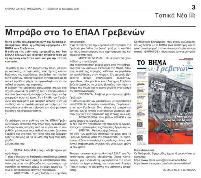 κοινοποίηση FacebookXPinterestWhatsApp Πρέπει να διαβάσετε «Συγχαρητήριο μήνυμα της Διεύθυνσης Δευτεροβάθμιας Εκπαίδευσης Γρεβενών για τη διάκριση μαθήτριας στο Πανελλήνιο Σχολικό Πρωτάθλημα Αντισφαίρισης ΓΕΛ & ΕΠΑΛ 2025-2026» 15 Απριλίου 2026 Η Αντρομάνα στην Δεσκάτη 14 Απριλίου 2026 Δήμος Γρεβενών: Έκθεση Φωτογραφίας & Ζωγραφικής «Τα όμορφα χωριά των Γρεβενών: Ο τόπος και οι άνθρωποι». 14 Απριλίου 2026 TO BAZAAR ΤΟΥ ΠΑΣΧΑ 2026 ΤΗΣ “ΕΛΠΙΔΑΣ” ΓΕΦΥΡΑ ΑΓΑΠΗΣ 14 Απριλίου 2026 myGrevenaΔεν είμαστε “φορείς ” της Τέταρτης Εξουσίας. Ο ρόλος μιας εφημερίδας είναι να αφουγκράζεται τους πόνους και τις χαρές ενός τόπου και των ανθρώπων του και αυτούς να διακονεί, να υπηρετεί τις ανάγκες τους, όχι να εξουσιάζει. ΕιδησεογραφίαΓρεβενά Μπράβο στο 1ο ΕΠΑΛ Γρεβενών Από myGrevena 29 Δεκεμβρίου 2025 ΕτικέτεςΕΠΑΛ κοινοποίηση FacebookXPinterestWhatsApp Προηγούμενο άρθροΚινηματογράφοςΕπόμενο άρθροΠρωτοσέλιδο 26.12.2025 Πρόσφατες δημοσιεύσεις Τα υφαντά της Σαμαρίνας 15 Απριλίου 2026 Από Δευτέρα 20 Απριλίου η υποβολή αιτήσεων επιχειρήσεων για τη νέα δράση απασχόλησης της ΔΥΠΑ με επιδότηση έως 14.220 € σε περιοχές απολιγνιτοποίησης 15 Απριλίου 2026 Πρόσκληση στις Πολιτιστικές Εκδηλώσεις των Αμυγδαλιών Γρεβενών. 15 Απριλίου 2026 Λειτουργία Ψυχιατρικού Ε.Ι. στο Γ.Ν. Γρεβενών 15 Απριλίου 2026 Ευχαριστήρια επιστολή 15 Απριλίου 2026