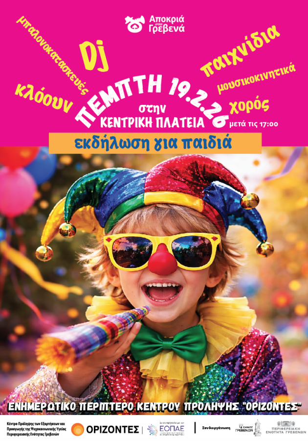 κοινοποίηση FacebookXPinterestWhatsApp Πρέπει να διαβάσετε ΛΕΙΤΟΥΡΓΙΑ ΠΡΑΤΗΡΙΩΝ ΚΑΥΣΙΜΩΝ Π.Ε. ΓΡΕΒΕΝΩΝ ΚΑΤΑ ΤΗ ΘΕΡΙΝΗ ΠΕΡΙΟΔΟ από 01/05/2026 έως και 30/09/2026 21 Απριλίου 2026 «Δράσεις για την Ψυχική Υγεία στο μαθητικό πληθυσμό» 21 Απριλίου 2026 ΕΥΧΑΡΙΣΤΗΡΙΟ 21 Απριλίου 2026 Κοινή δήλωση των Επικεφαλής της Λαϊκής Συσπείρωσης στους Δήμους της Δυτικής Μακεδονίας, για τον σχεδιασμό της κυβέρνησης για τους δημόσιους παιδικούς και βρεφονηπιακούς σταθμούς... 21 Απριλίου 2026 myGrevenaΔεν είμαστε “φορείς ” της Τέταρτης Εξουσίας. Ο ρόλος μιας εφημερίδας είναι να αφουγκράζεται τους πόνους και τις χαρές ενός τόπου και των ανθρώπων του και αυτούς να διακονεί, να υπηρετεί τις ανάγκες τους, όχι να εξουσιάζει. ΕιδησεογραφίαΓρεβενάΕκδηλώσεις ΟΡΙΖΟΝΤΕΣ: Αποκριάτικη εκδήλωση για τα παιδιά Από myGrevena 16 Φεβρουαρίου 2026 ΕτικέτεςΑΠΟΚΡΙΕΣΟΡΙΖΟΝΤΕΣ κοινοποίηση FacebookXPinterestWhatsApp Προηγούμενο άρθροΛόγια ΣταράταΕπόμενο άρθροΜε μεγάλη επιτυχία πραγματοποιήθηκε στο κατάμεστο αμφιθέατρο ‘’Ιωάννης Καποδίστριας ‘’ του Πολεμικού Μουσείου Αθηνών, η κοπή της βασιλόπιτας του νεοσύστατου Συλλόγου Γρεβενιωτών Αττικής ΕΛΙΜΕΙΑ. Πρόσφατες δημοσιεύσεις Γιορτάζει ο Άγιος Γεώργιος Γρεβενών 21 Απριλίου 2026 ΝΗΜΑΤΑ 21 Απριλίου 2026 Αποκλειστικά ηλεκτρονικά οι μεταβιβάσεις ΙΧ επιβατικών και δίκυκλων από τις 27-4-2026 21 Απριλίου 2026 1° ΠΑΝΕΛΛΗΝΙΟ ΜΑΘΗΤΙΚΟ ΦΕΣΤΙΒΑΛ ΑΡΧΑΙΟΥ ΚΑΙ ΣΥΓΧΡΟΝΟΥ ΘΕΑΤΡΟΥ 21 Απριλίου 2026 Συνελήφθησαν -3- ημεδαποί το τελευταίο 24ωρο για οδήγηση υπό την επήρεια μέθης και επικίνδυνη οδήγηση σε περιοχές της Κοζάνης, των Γρεβενών και της Φλώρινας 21 Απριλίου 2026