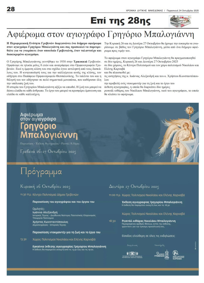 κοινοποίηση FacebookTwitterPinterestWhatsApp Πρέπει να διαβάσετε 20 + 1 Λόγοι ΑΜΕΣΗΣ ΑΝΑΒΑΘΜΙΣΗΣ του Νοσοκομείου ΓΡΕΒΕΝΩΝ 25 Οκτωβρίου 2025 Γρεβενά: Ομαδικός Περίπατος Ευαισθητοποίησης για την Πρόληψη του Καρκίνου του Μαστού. 24 Οκτωβρίου 2025 Εκδήλωση της Σχολής Μαθητείας για τη Νέα Ειδικότητα “Τεχνίτης Βιομηχανικών Αυτοματισμών” στα ΓΡΕΒΕΝΑ 24 Οκτωβρίου 2025 Μεταγωνιστικό δελτίο τύπου Kastraki Trail 2025 και ευχαριστίες 24 Οκτωβρίου 2025 myGrevenaΔεν είμαστε “φορείς ” της Τέταρτης Εξουσίας. Ο ρόλος μιας εφημερίδας είναι να αφουγκράζεται τους πόνους και τις χαρές ενός τόπου και των ανθρώπων του και αυτούς να διακονεί, να υπηρετεί τις ανάγκες τους, όχι να εξουσιάζει. ΕιδησεογραφίαΓρεβενάΕκδηλώσεις Στιγμές από την έκθεση του αγιογράφου Γρηγόρη Μπαλογιάννη στα Γρεβενά Από myGrevena 26 Οκτωβρίου 2025 κοινοποίηση FacebookTwitterPinterestWhatsApp Προηγούμενο άρθροΤα Γρεβενά στο επίκεντρο της Κυκλικής και Διαμοιραστικής Οικονομίας.Επόμενο άρθρο16η Πανελλαδική εκδήλωση Εορτασμού Θηλασμού και Μητρότητας – ΓΡΕΒΕΝΑ Πρόσφατες δημοσιεύσεις 16η Πανελλαδική εκδήλωση Εορτασμού Θηλασμού και Μητρότητας – ΓΡΕΒΕΝΑ 27 Οκτωβρίου 2025 Τα Γρεβενά στο επίκεντρο της Κυκλικής και Διαμοιραστικής Οικονομίας. 25 Οκτωβρίου 2025 Το Δημοτικό Συμβούλιο Γρεβενών στηρίζει τον αγώνα και τα δίκαια αιτήματα των αγροτών. 25 Οκτωβρίου 2025 Υπογράφηκε η σύμβαση για την ανακατασκευή των χειρουργείων του Γενικού Νοσοκομείου Γρεβενών 25 Οκτωβρίου 2025 Συνελήφθησαν δύο αλλοδαπές γυναίκες σε περιοχή των Γρεβενών για κλοπή προϊόντων από κατάστημα Super Market 25 Οκτωβρίου 2025