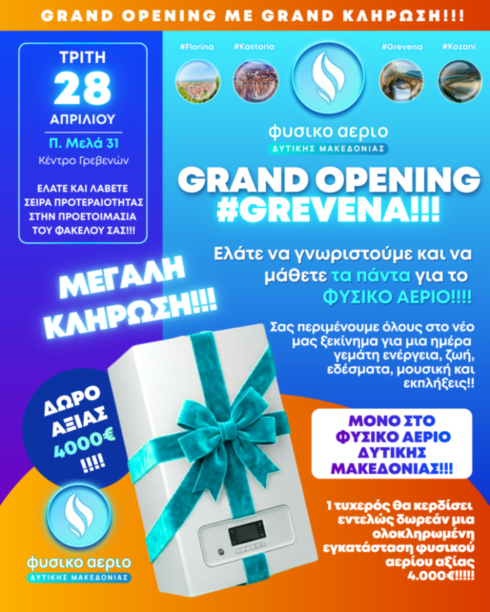 Η ημέρα των εγκαινίων κρύβει μια μοναδική ευκαιρία για τους κατοίκους των Γρεβενών. Ένας τυχερός θα κερδίσει εντελώς δωρεάν μια ολοκληρωμένη εγκατάσταση φυσικού αερίου αξίας 4.000€, που περιλαμβάνει τα πάντα: από τη μελέτη και τον λέβητα μέχρι την πλήρη τοποθέτηση!