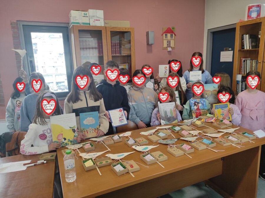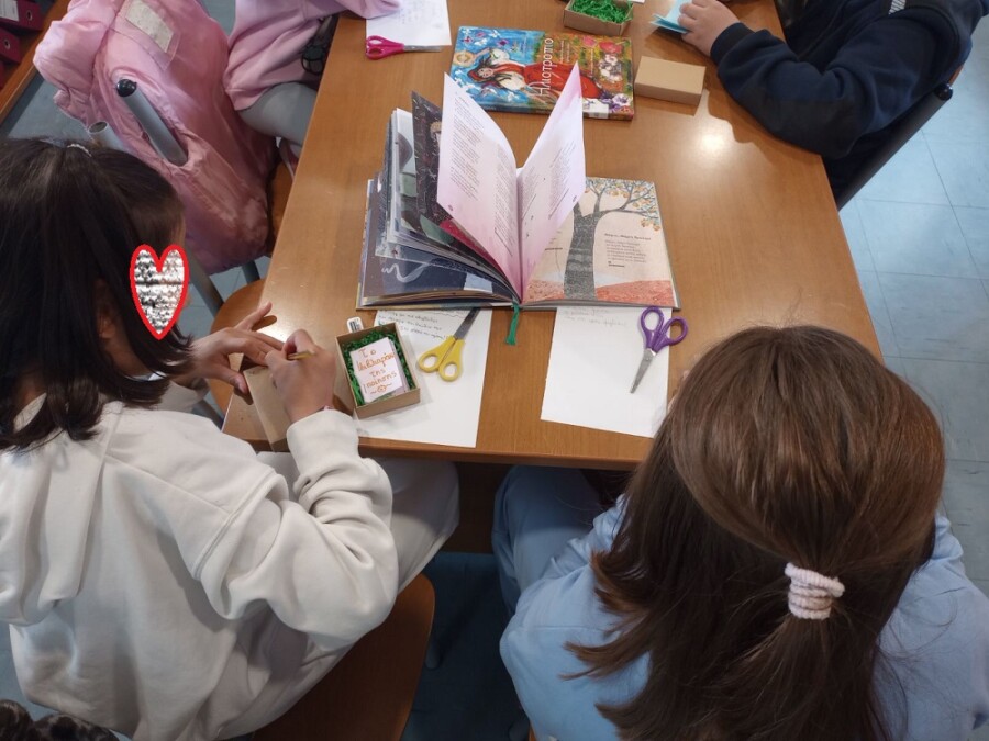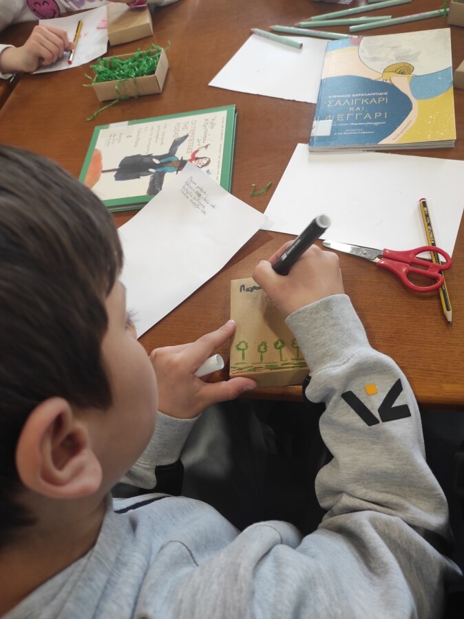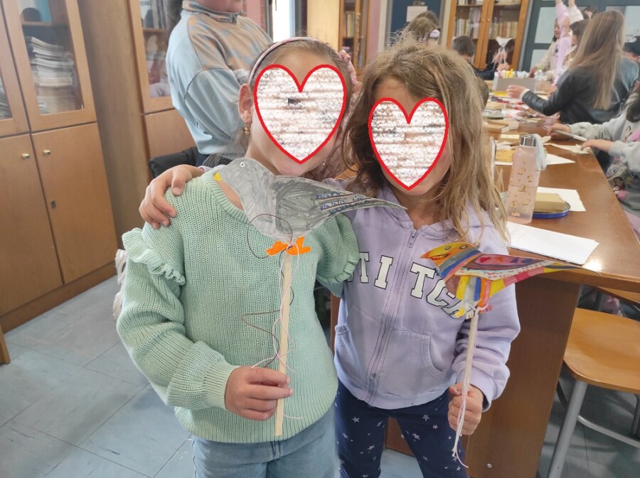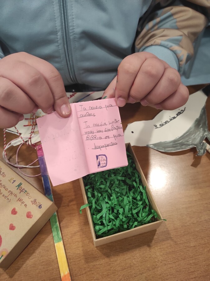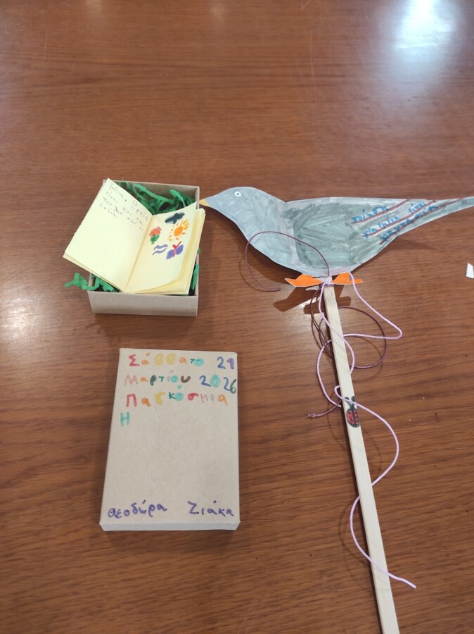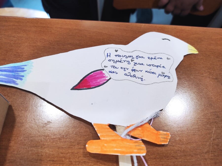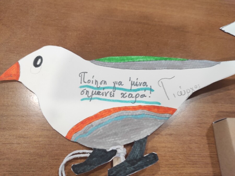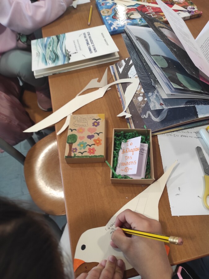 Στο δεύτερο μέρος της δράσης τα παιδιά εμπνευσμένα από όλα όσα άκουσαν συνέθεσαν τους δικούς τους στίχους για τα χελιδόνια, την άνοιξη, τα Γρεβενά, τα βιβλία, τα παιχνίδια, τα ζώα, τα φεγγάρια, τα ελληνικά νησιά, όλα όσα αποτελούν πηγή έμπνευσης για αυτά! Η βιβλιοθήκη γέμισε εικόνες, χρώματα, μυρωδιές, ήχους, ενθουσιασμό! Τα ποιήματα τους τα έγραψαν στο δώρο που τους πρόσφεραν τα πουλιά της ποίησης, δηλαδή σε μικρά βιβλιαράκια τοποθετημένα σε κουτιά που τα παιδιά τα εξωράισαν με χρώματα και σχέδια ανοιξιάτικα. Στο τέλος τους μοιράσαμε πουλιά από χαρτόνι και πάνω τους έγραψαν τι σημαίνει η ποίηση για αυτά.