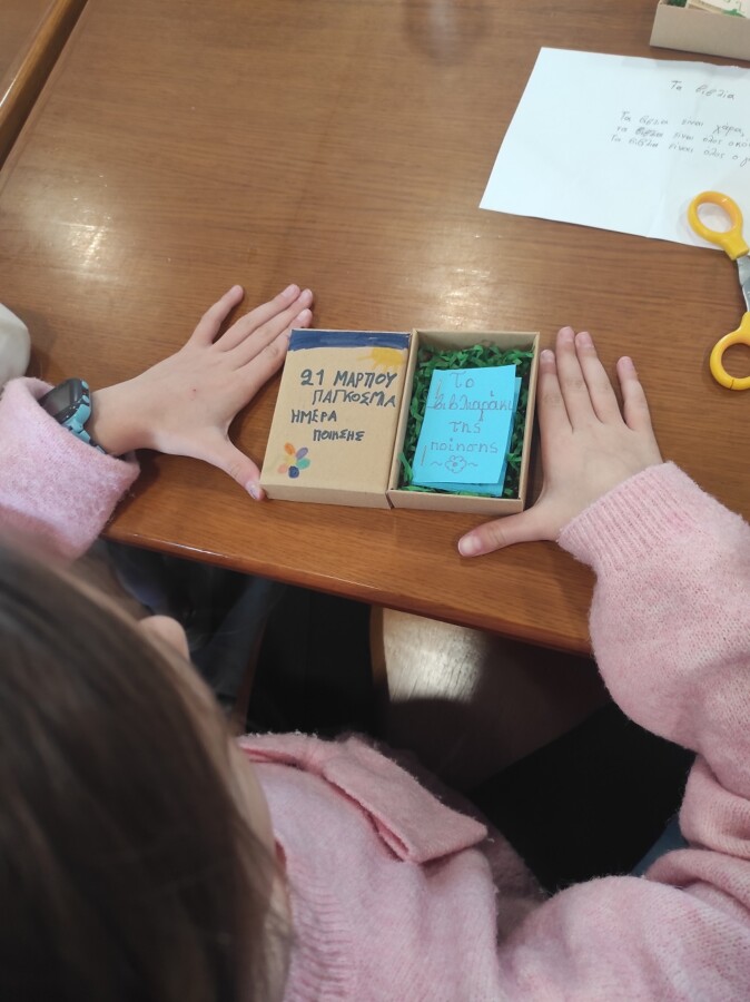 Η όμορφη παρέα ήρθε στο αναγνωστήριο της βιβλιοθήκης και μαζί της έφερε ομορφιά, χαμόγελα και ευχάριστη διάθεση. Η ανυπομονησία ήταν ζωγραφισμένη στα πρόσωπά τους και ξεκινήσαμε! Αναφερθήκαμε στην σημασία της ημέρας και τονίσαμε στα παιδιά ότι είναι μια μέρα με χρώμα ελληνικό, καθώς ο εμπνευστής της είναι ο ποιητής Μιχαήλ Μήτρας και η πρώτη μέρα ποίησης γιορτάστηκε στην Αθήνα. Η βιβλιοθήκη μας γέμισε στίχους σπουδαίων ελλήνων ποιητών, καθώς διαβάσαμε ποιήματα του Γ. Ρίτσου, του Κ. Καρυωτάκη, του Γ. Σεφέρη, του Ν. Εγγονόπουλου, του Ο. Ελύτη, αλλά και νεότερων δημιουργών , όπως ο Γ. Παπαδάτος, η Ρ. Παππά, η Μ. Μιχαηλίδου-Καδή. Στο τέλος ξεφύλλισαν και περιεργάστηκαν τα βιβλία που τους διαβάσαμε, καθώς η βιβλιοθήκη μας διαθέτει πληθώρα ποιητικών αναγνωσμάτων.