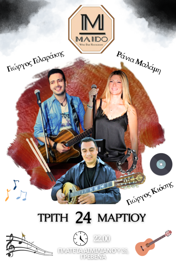 Ο Γιώργος Γελαράκης, η Ράνια Μαλάμη και ο Γιώργος Κιόσης, συνεχίζουν τις εμφανίσεις τους σε όλη την Ελλάδα και έρχονται στον υπέροχο χώρο “Maido Wine Bar Restaurant”, με παρεΐστικη διάθεση….καλώντας μας σε μια μουσική βραδιά με σκοπό να τραγουδήσουμε όλοι μαζί…σε ένα πρόγραμμα που διαμορφώνεται από το κοινό!!!
